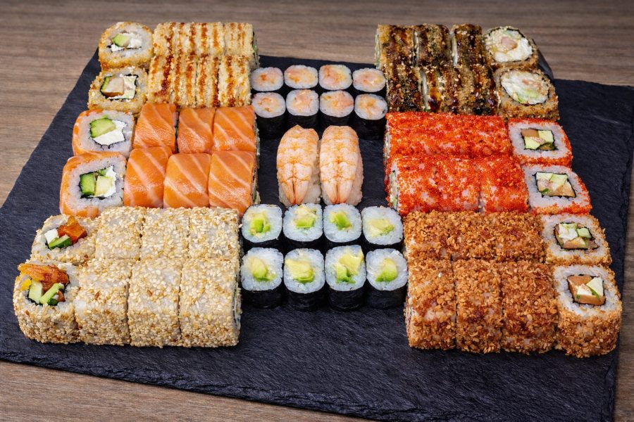 Sastāvā – Chicken Tempura, Salmon Tempura, Philadelphia deluxe, Bali, Kalifornija ar lasi, Takoma, Ebi maki, Avocado maki, 2 nigiri ar tīģergarneli.