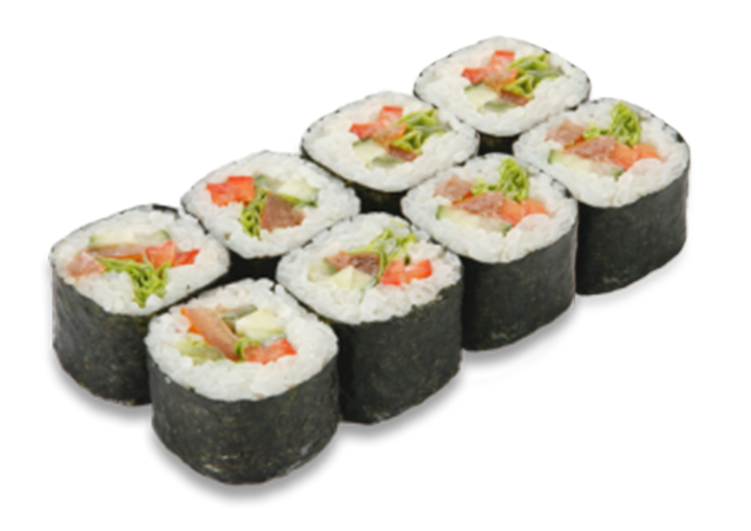 Rolls ar sarkano piparu, gurķi, tomātu, salātu, japāņu majonēzi.