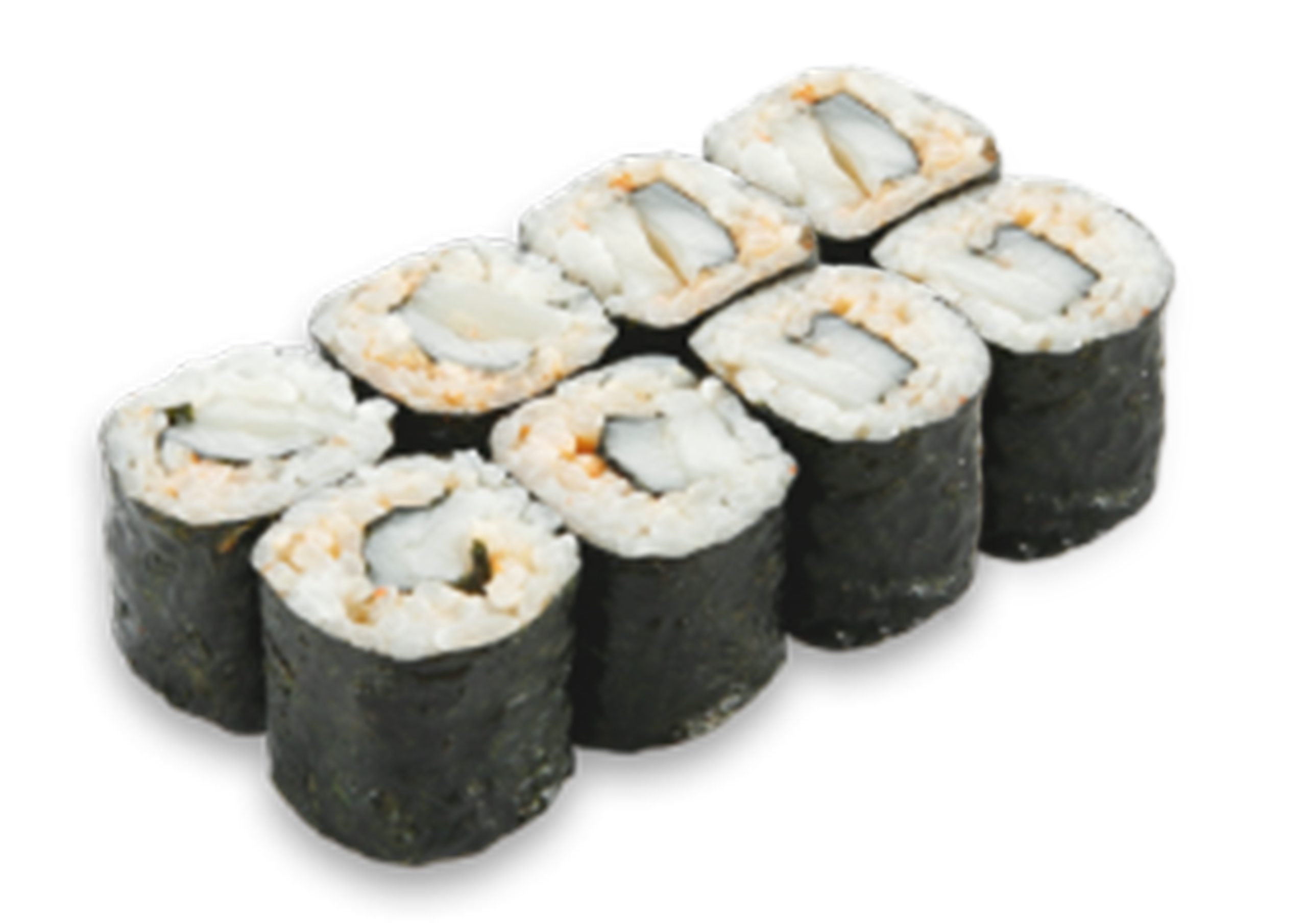 Pikantais rolls ar kūpinātu kalmāru un spaisi mērci.