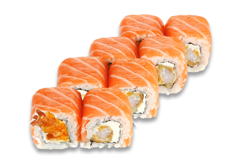 Rolls ar laša fileju, krēmsieru, tīģergarneli apceptu tempuras mīklā.