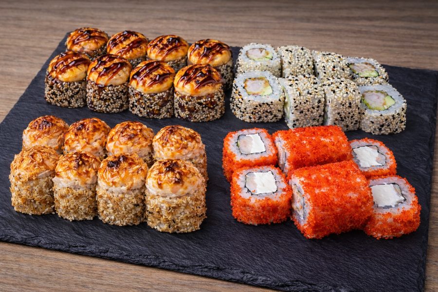 Sastāvā rolli – Karstais rolls ar mīdijām, karstais rolls ar vistu, rolls ar tempūras garneli, sarkanais rolls ar tīģergarneli.