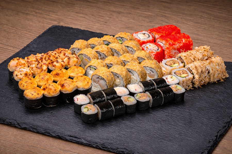 6. Rolls ar sarkanajiem masago ikriem, tīģergarneli, krēmsieru