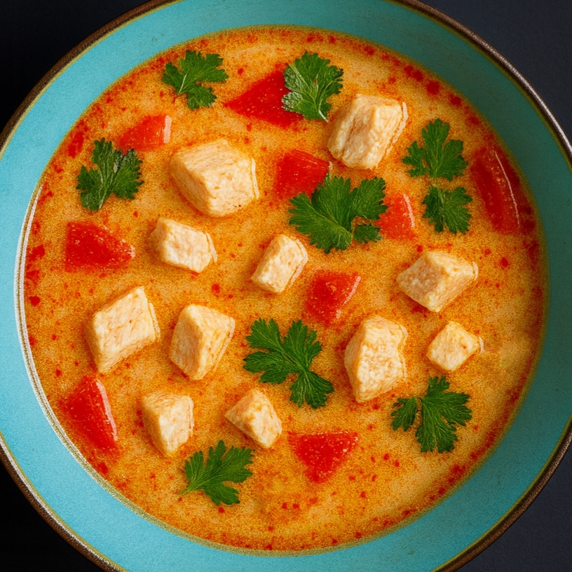 Tom Yum zupa ar kokosrieksta pienu, vistas fileju, šampinjoniem, tomātiem un zaļumiem.